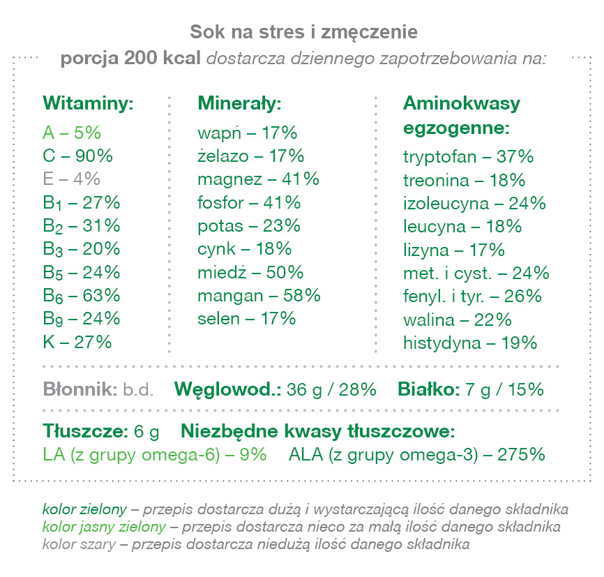 To wyjątkowy sok wspierający zdrowie układu nerwowego oraz poprawiający samopoczucie w sytuacjach stresowych i stanach zmęczenia. Dzięki wysokiej zawartości kwasów tłuszczowych omega-3, magnezu i witamin z grupy B, sok ten pomaga stabilizować nastrój i wspiera pracę mózgu.